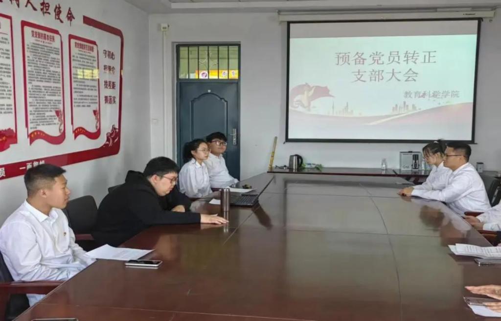 会议伊始,教育科学学院学生第一党支部书记关天宇介绍本次大会党员出席情况,并介绍会议流程。按照会议流程,全体参会同志起立齐唱国歌,再由张志卓等九名预备党员分别宣读了自己的转正申请,客观向党组织汇报在作为预备党员期间的思想状况和学习、工作情况,同时剖析自身不足并提出了改正措施。