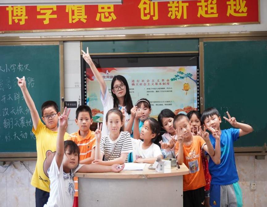在这段时间,我收获了数不尽的感动。每个瞬间我都会铭记于心,学生们灿烂的笑容、亲切的问候、踊跃的发言、奇妙的思想......每天早晨,他们都会跑过来亲切地喊:老师早上好!稚嫩的童声像太阳一般,温暖你的心房。我忘不掉的,是与各位志愿者教师们并肩作战的每一个夜晚,是熬夜备课与排练的点点滴滴,这些都编织成藤曼在我的思绪里生根发芽,让我朝着更好的自己前进。五天很短,我像是一个过客般在他们的世界短暂停留了一小会;五天又很长,在我的人生中留下了浓厚的一抹色彩。这段记忆会一直留存在我的心底,我将带着期许与希望奔赴下一场山海,在顶峰,再相见!感谢这次三下乡,让我有了一个圆满的大学时光!